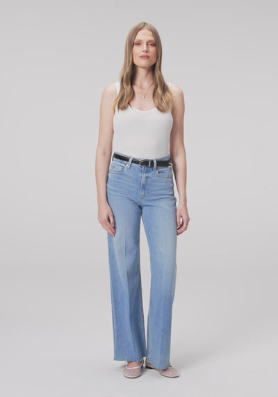 This modern high-waisted wide leg has an easy, relaxed fit with a 31" inseam, welt utility pockets, and a raw hem. Cut from our TRANSCEND VINTAGE denim in a perfectly worn-in light wash with natural fading, this style has the look of authentic vintage denim but is incredibly comfortable with plenty of stretch and recovery.