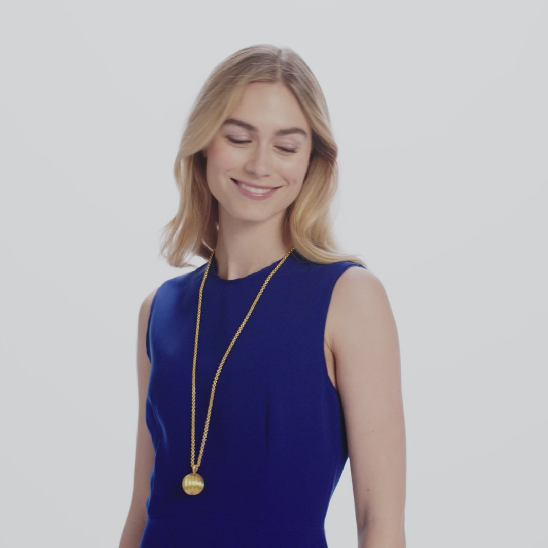 A fluted, lightly hammered golden sphere dangles from a smooth rolo chain.